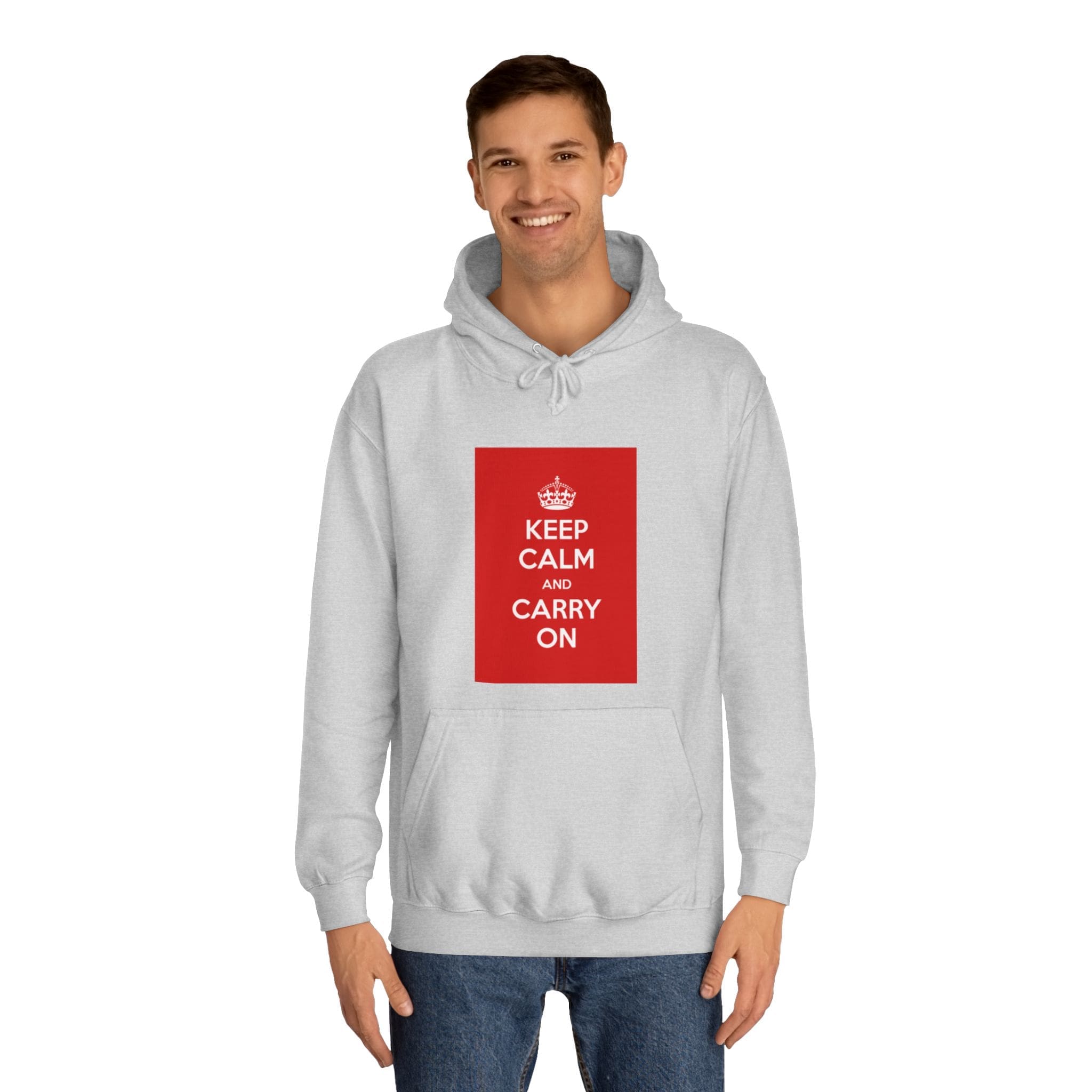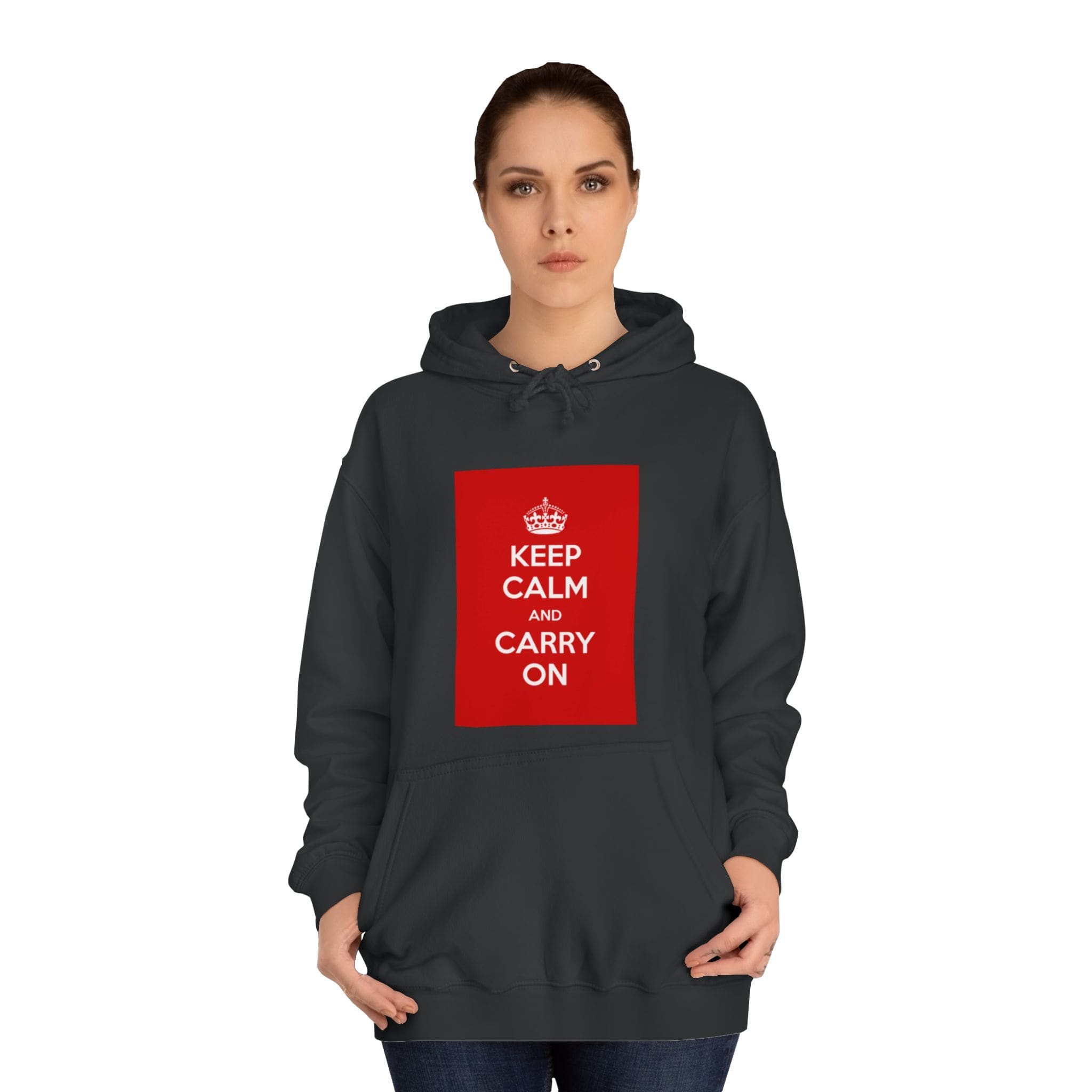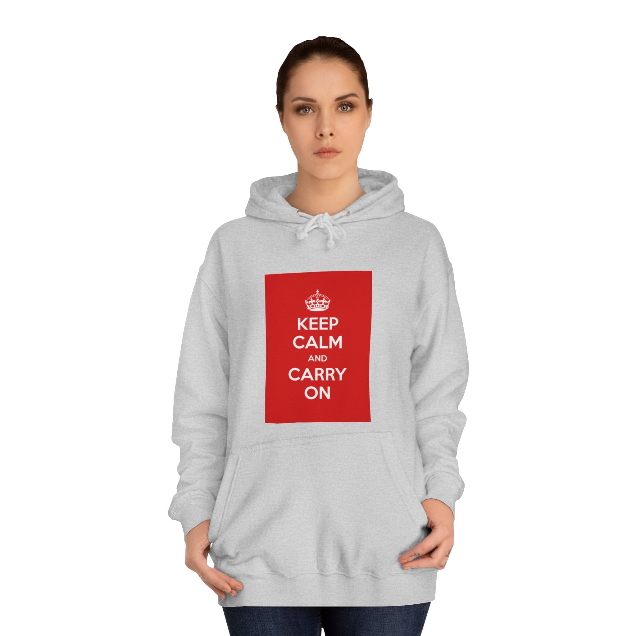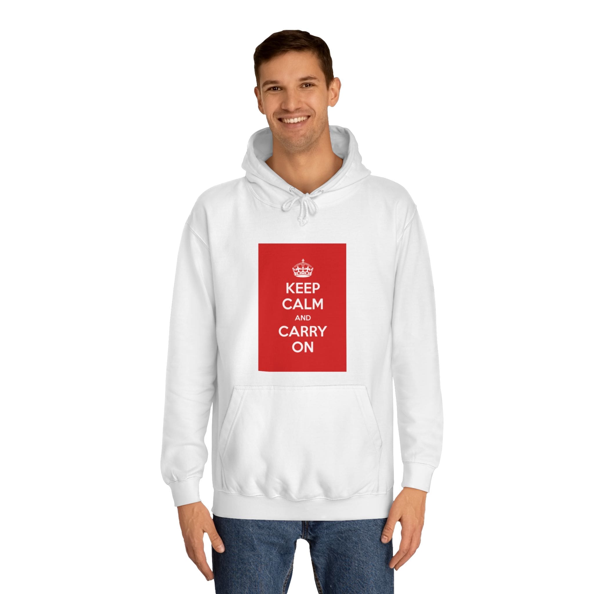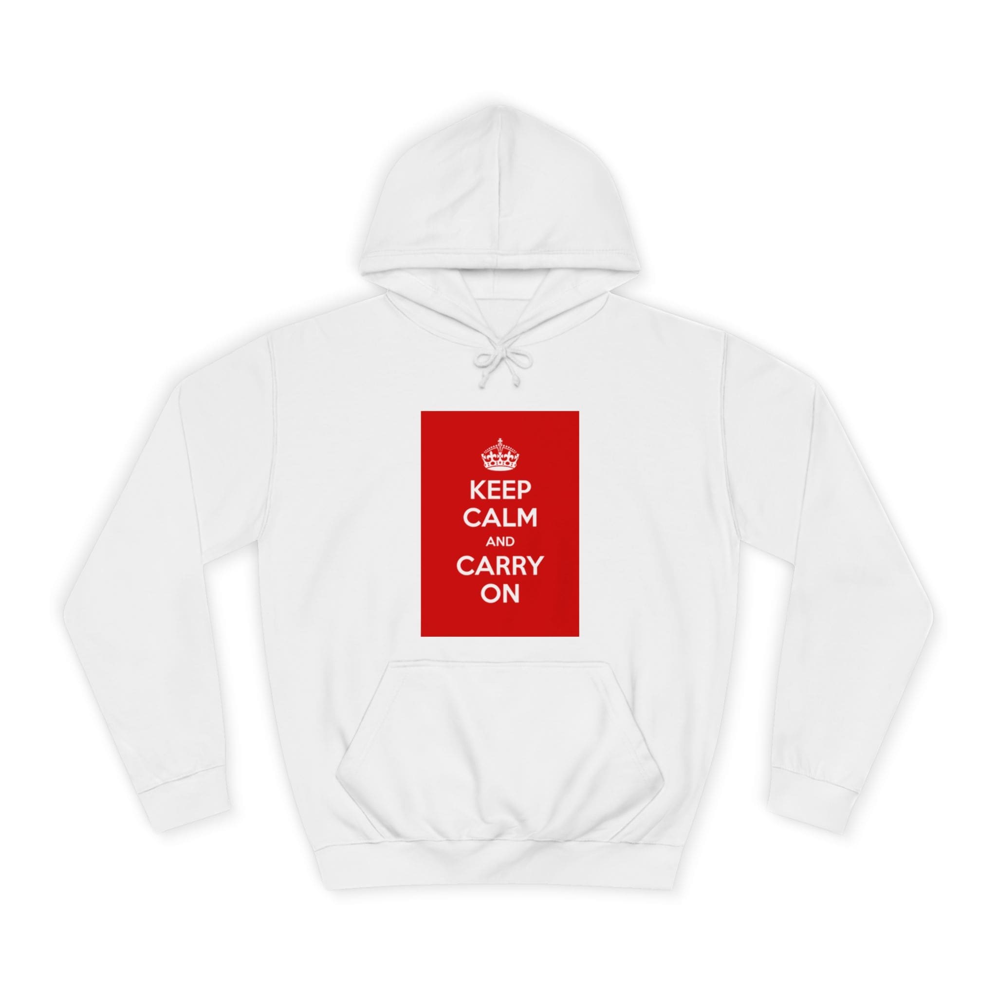 A cozy, lived-in hoodie that quietly channels classic British resilience. The clean white canvas frames a bold red “KEEP CALM AND CARRY ON” panel — a simple statement that feels both nostalgic and reassuring. Soft, medium-weight fabric and a roomy, loose fit invite long commutes, late-night study sessions, or slow weekend mornings. The kangaroo pouch keeps hands warm while the adjustable hood tucks close against wind and rain. Thoughtful construction — side seams for shape retention, a tear-away label, and responsibly certified materials — makes this a reliable layer you’ll reach for again and again. Wear it when you need a calm reminder or when you want your outfit to speak softly but confidently.
