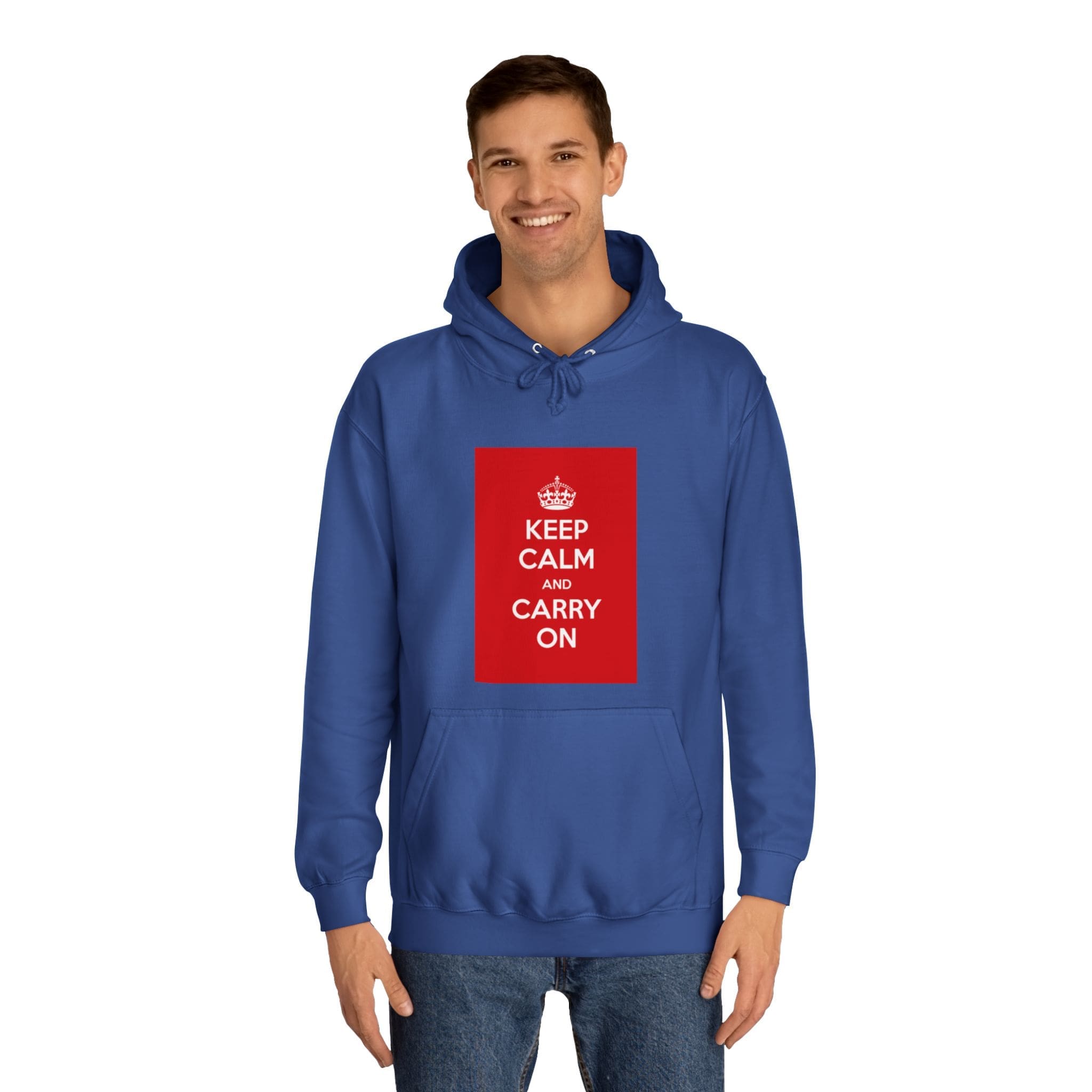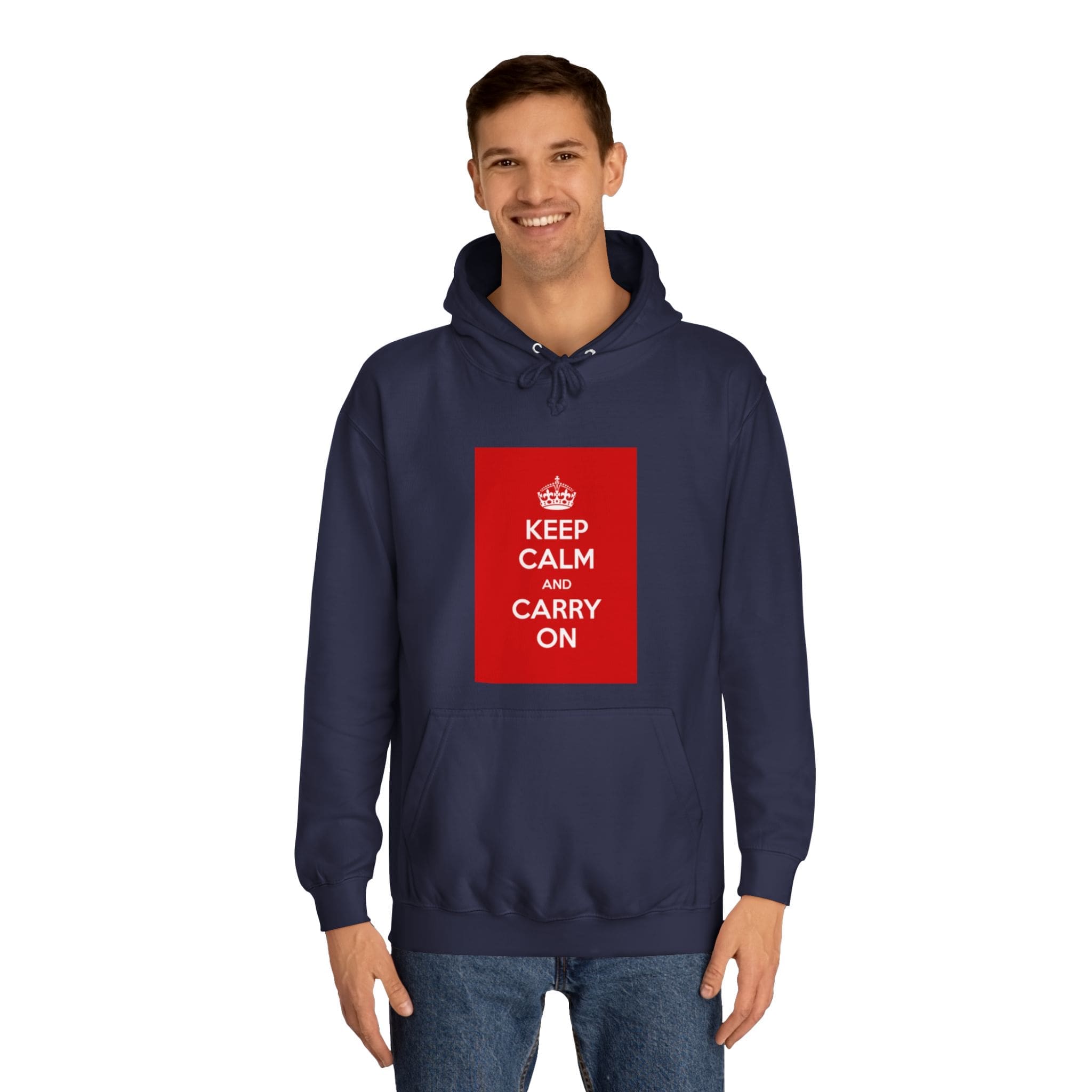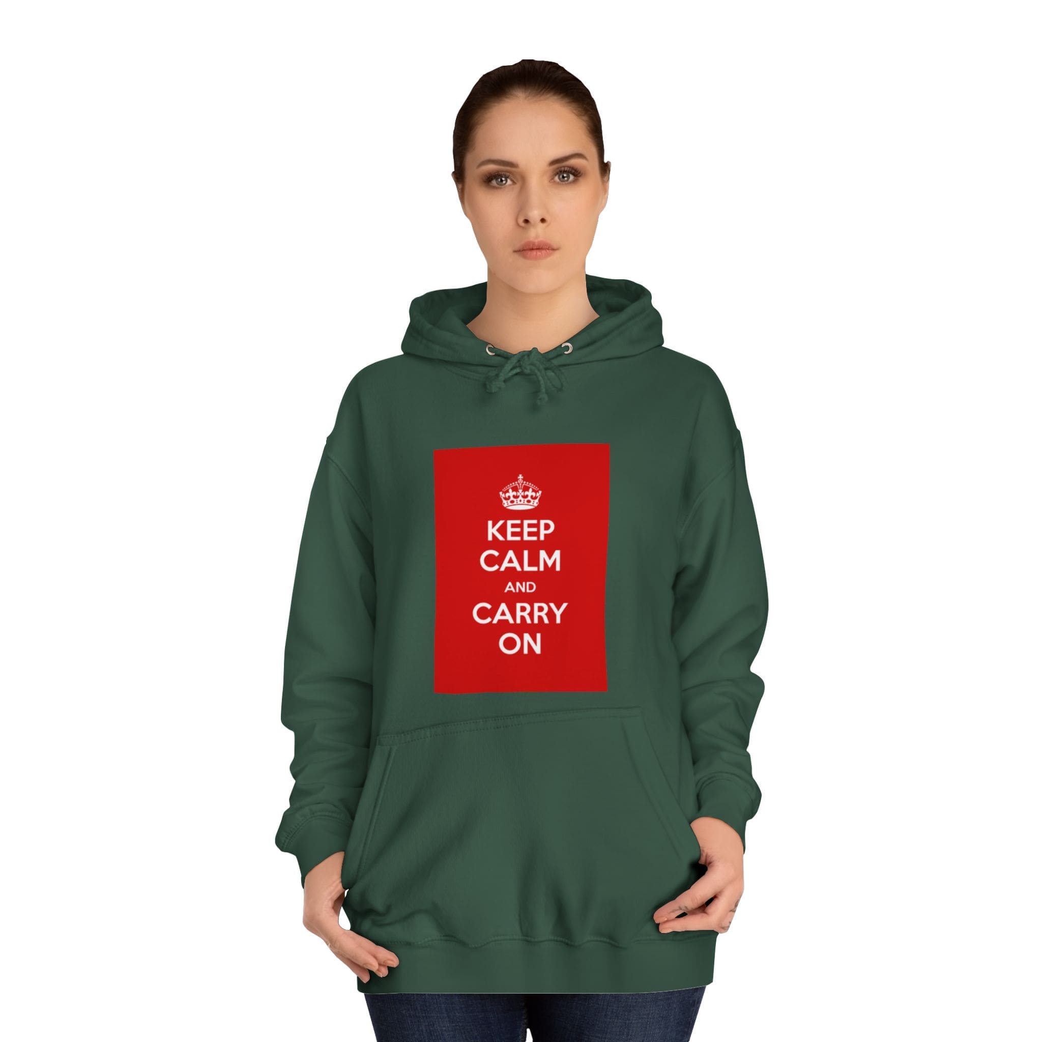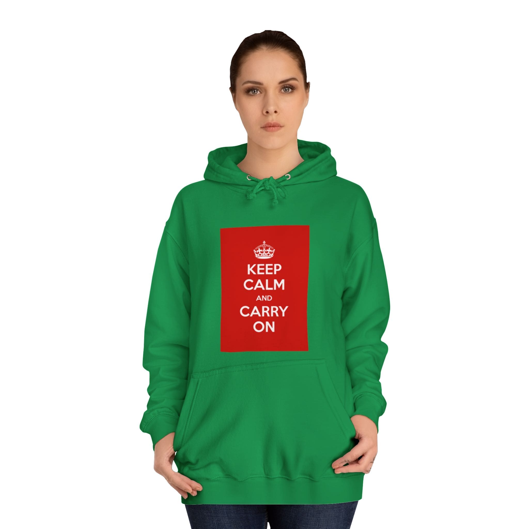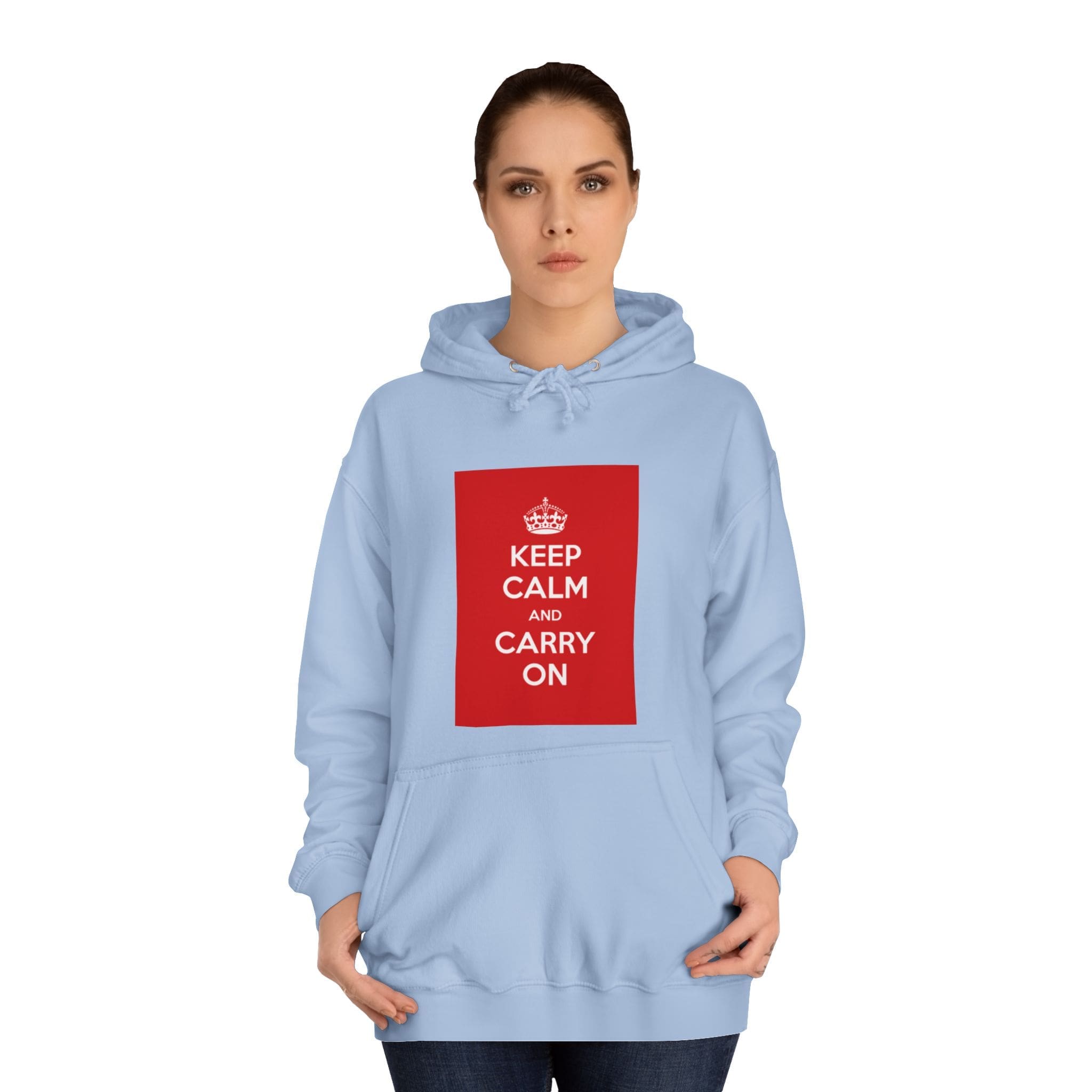 A cozy, lived-in hoodie that quietly channels classic British resilience. The clean white canvas frames a bold red “KEEP CALM AND CARRY ON” panel — a simple statement that feels both nostalgic and reassuring. Soft, medium-weight fabric and a roomy, loose fit invite long commutes, late-night study sessions, or slow weekend mornings. The kangaroo pouch keeps hands warm while the adjustable hood tucks close against wind and rain. Thoughtful construction — side seams for shape retention, a tear-away label, and responsibly certified materials — makes this a reliable layer you’ll reach for again and again. Wear it when you need a calm reminder or when you want your outfit to speak softly but confidently.