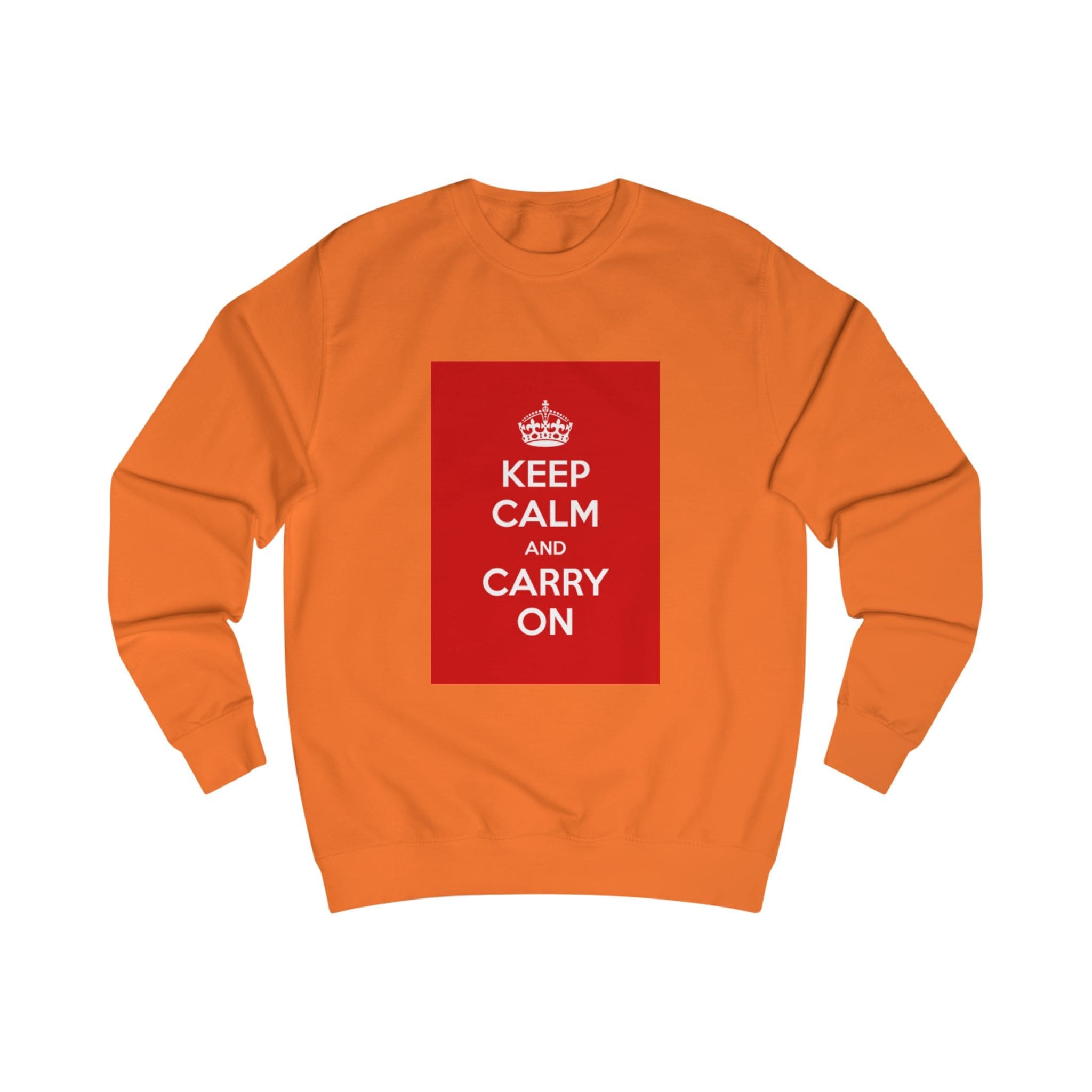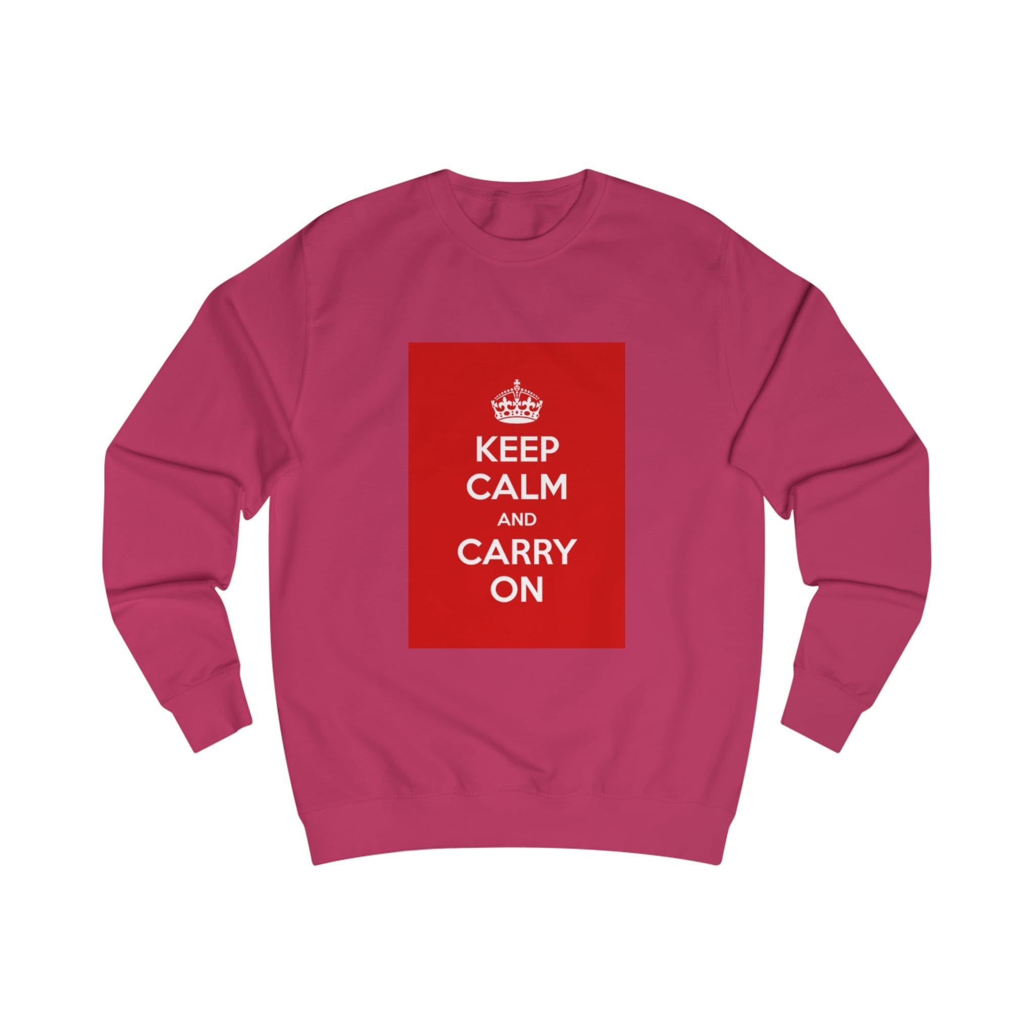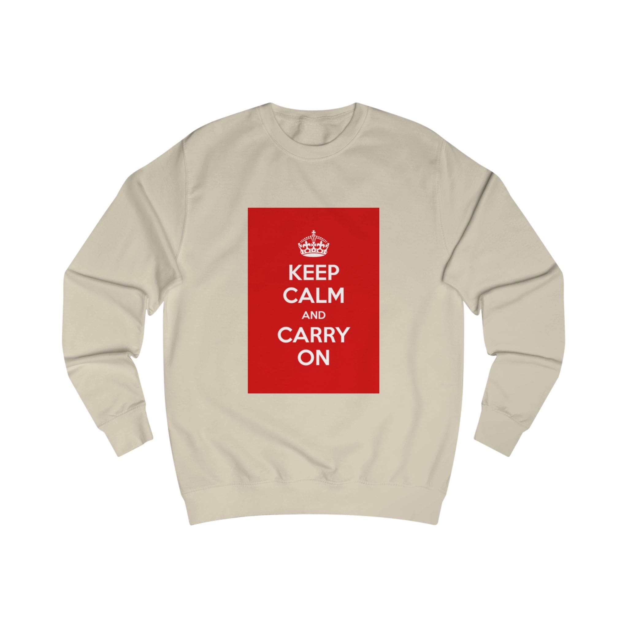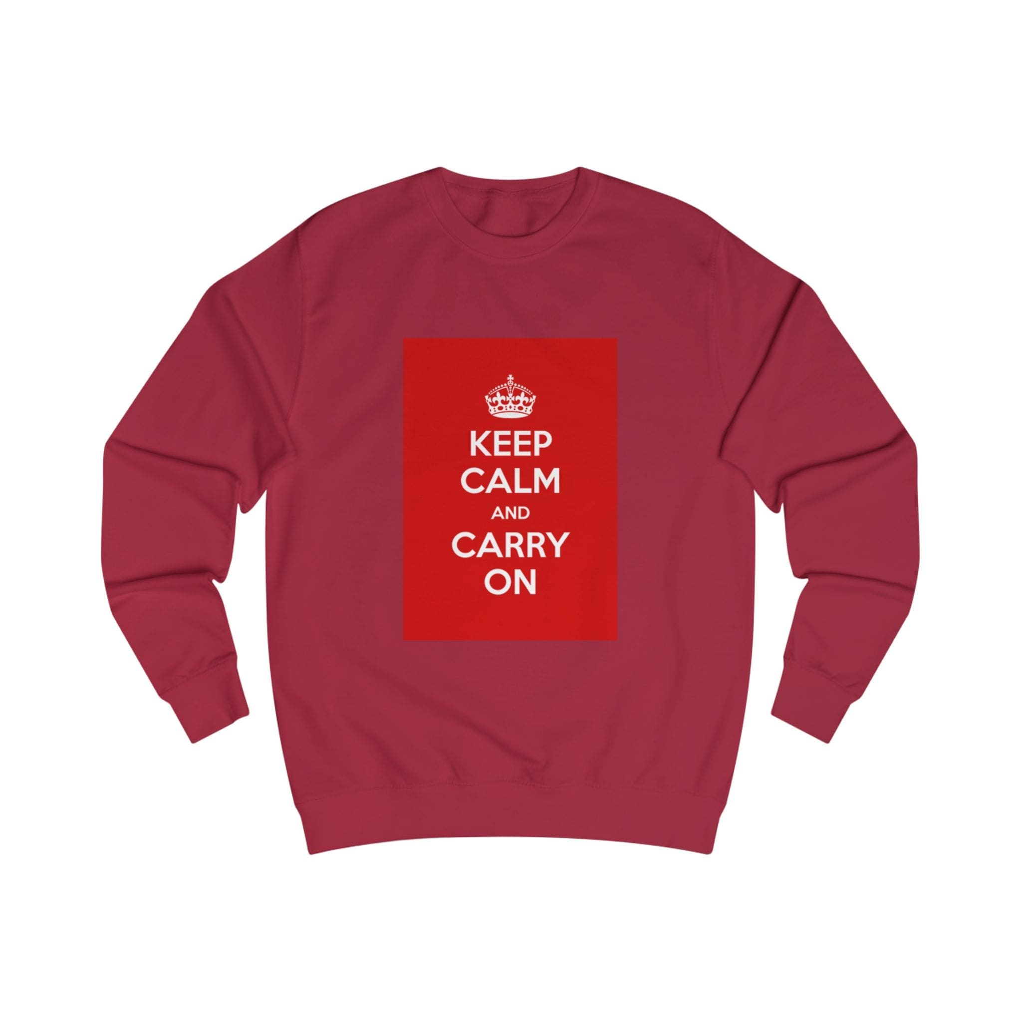 This sweatshirt carries a quiet, resilient energy — a bold red block with the classic “KEEP CALM AND CARRY ON” message set against clean white fabric. It feels like a steady breath on a busy day: substantial medium-weight cotton blend, soft inside, and a structured fit that holds its shape. Wear it on a commute, layered for chilly mornings, or at a cozy meet-up when you want to say something calm but confident without saying a word. The ribbed collar and side seams lend a refined silhouette, while the tear-away label keeps the back of the neck comfortable. It’s for people who appreciate vintage-inspired graphics and practical construction — simple, steady, and quietly bold.