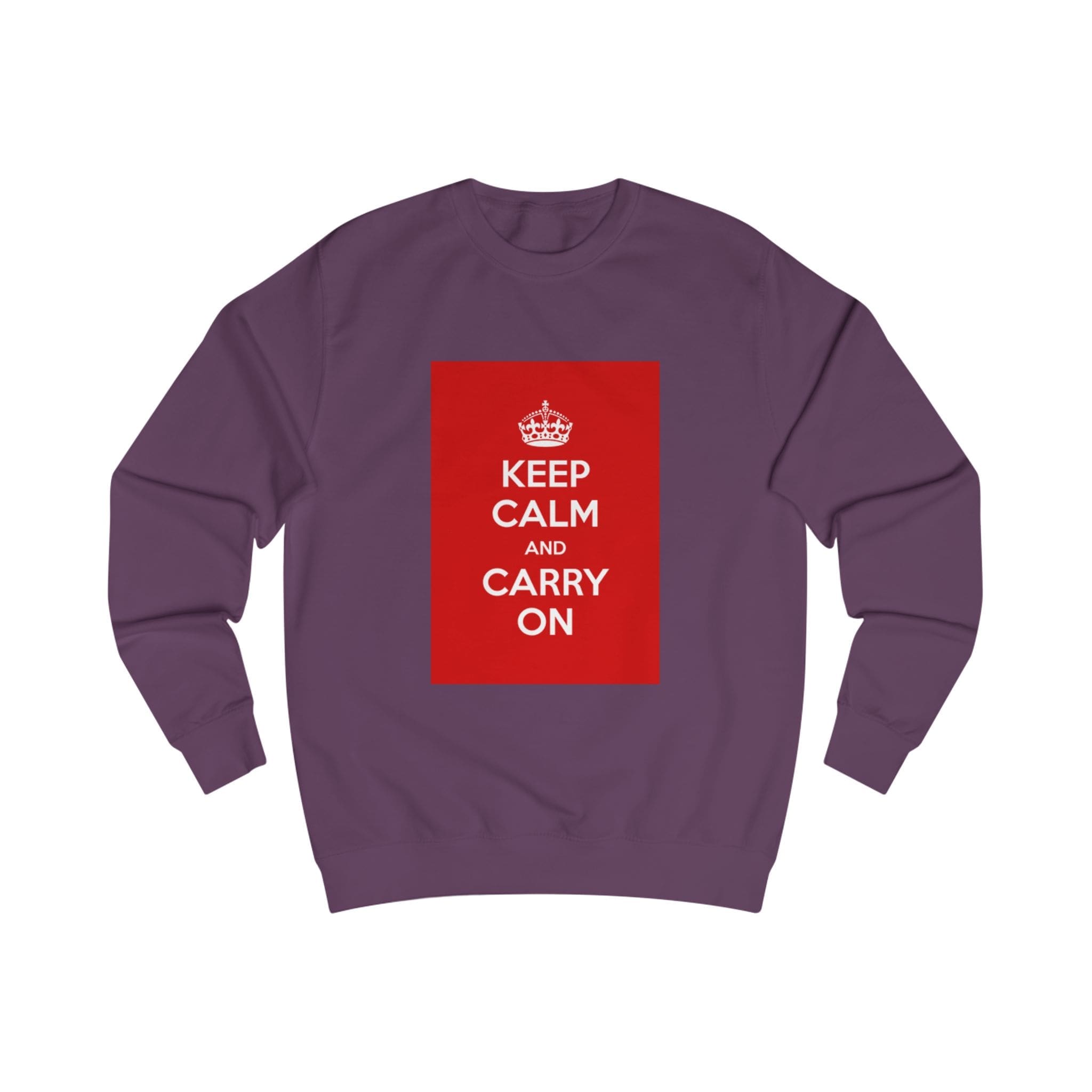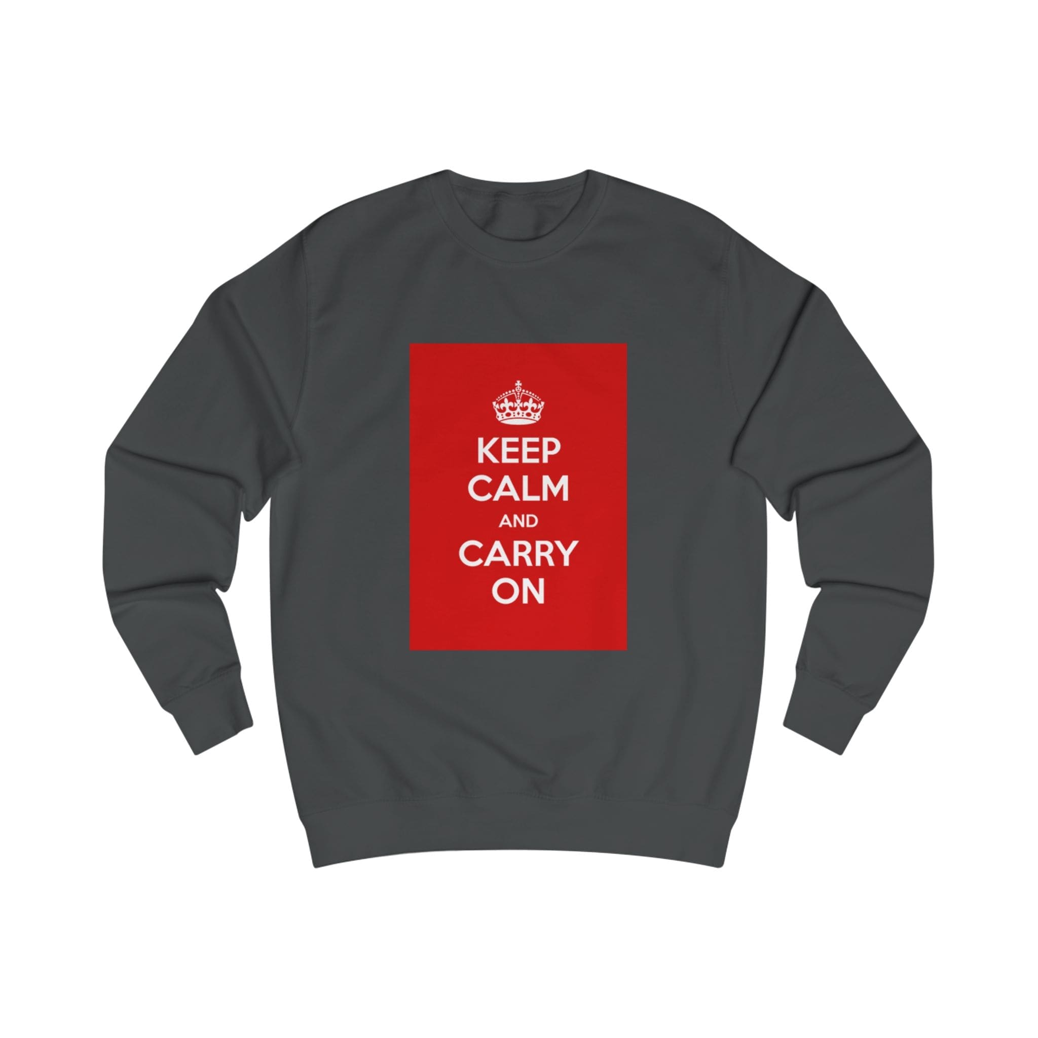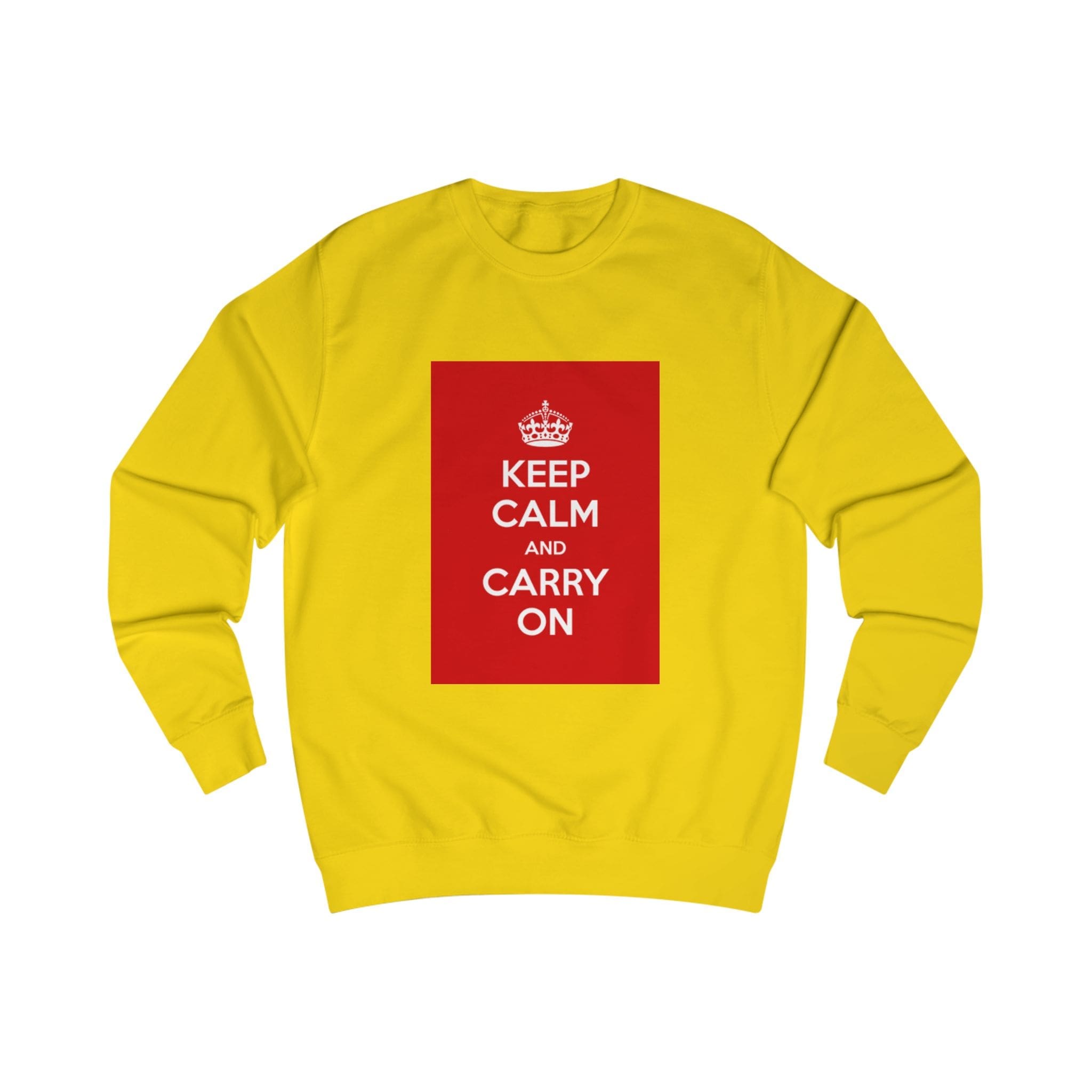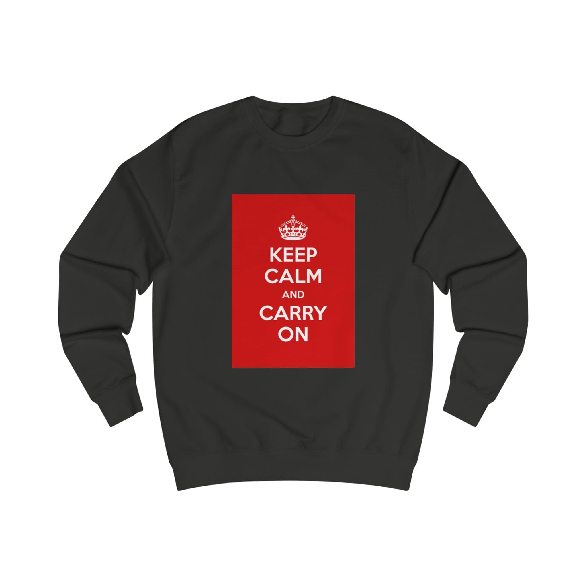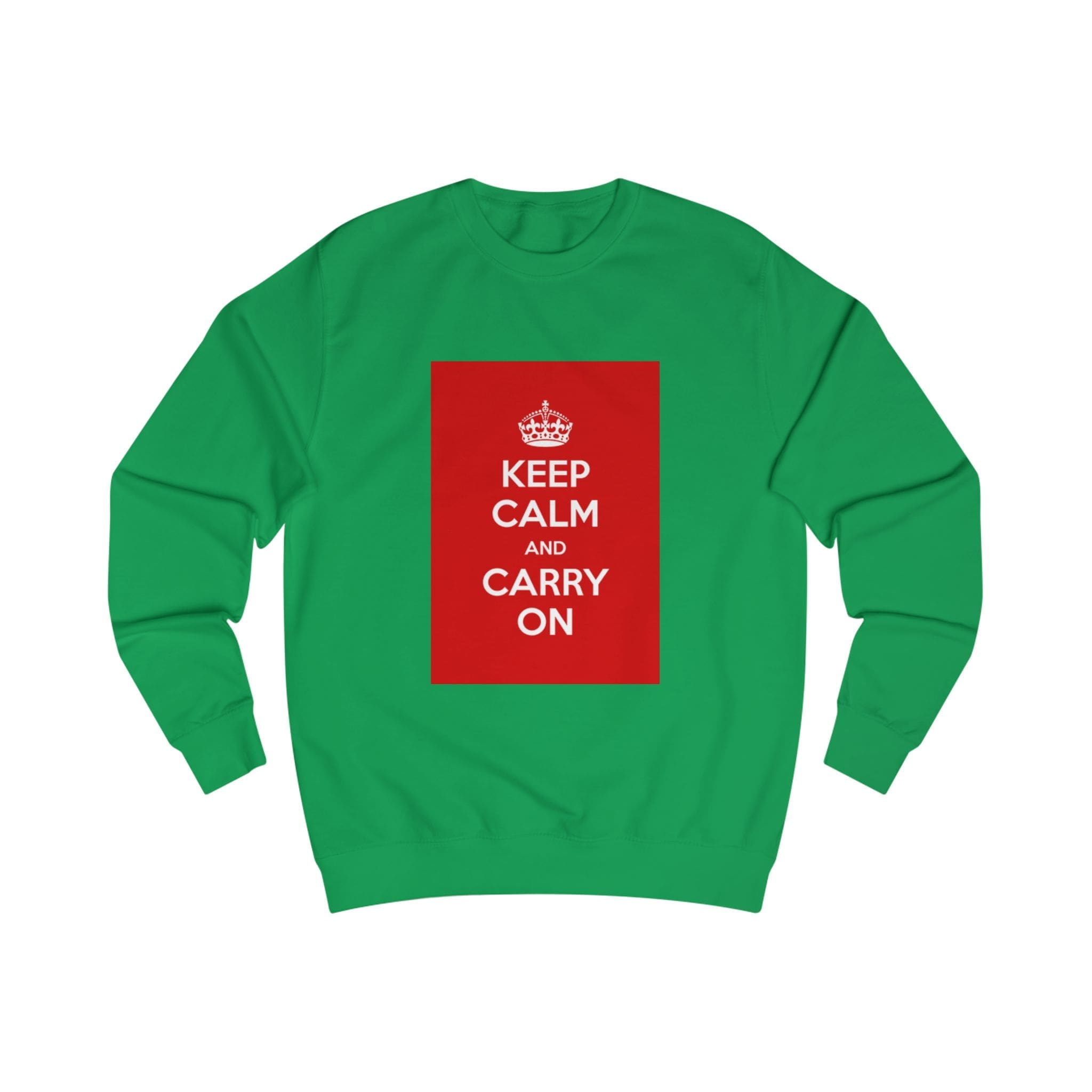This sweatshirt carries a quiet, resilient energy — a bold red block with the classic “KEEP CALM AND CARRY ON” message set against clean white fabric. It feels like a steady breath on a busy day: substantial medium-weight cotton blend, soft inside, and a structured fit that holds its shape. Wear it on a commute, layered for chilly mornings, or at a cozy meet-up when you want to say something calm but confident without saying a word. The ribbed collar and side seams lend a refined silhouette, while the tear-away label keeps the back of the neck comfortable. It’s for people who appreciate vintage-inspired graphics and practical construction — simple, steady, and quietly bold.